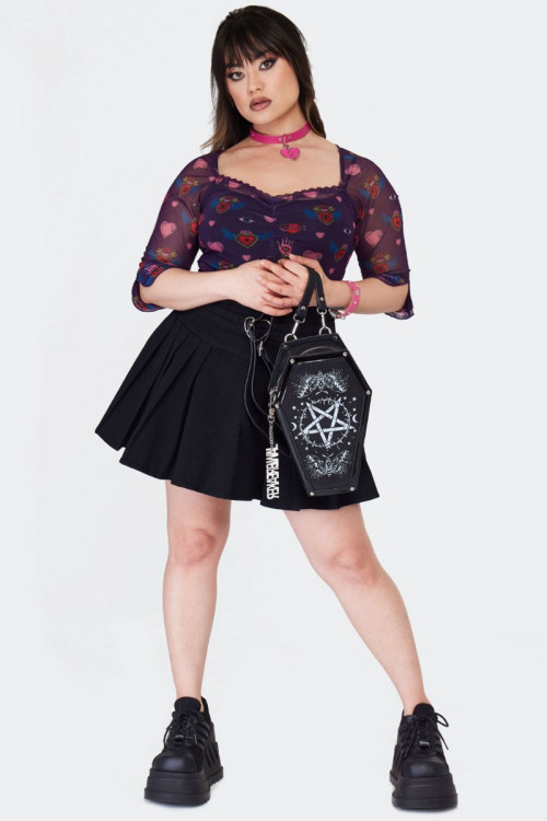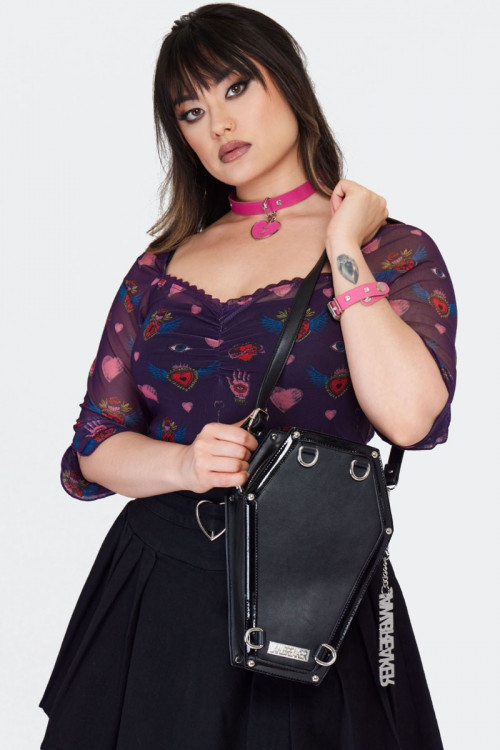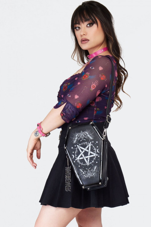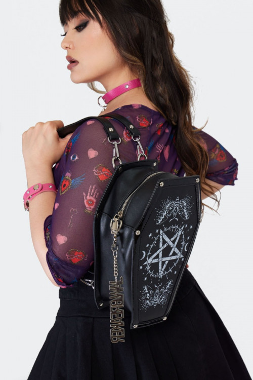 Černá crossbody kabelka ve tvaru rakve s potiskem pentagramu, můry, hvězd a měsíce, včetně stříbrných úchytů s odnímatelnými popruhy, zapínáním na zip v horní části a stahovacím zipem s logem Jawbreaker. Lze nosit i jako batoh.
