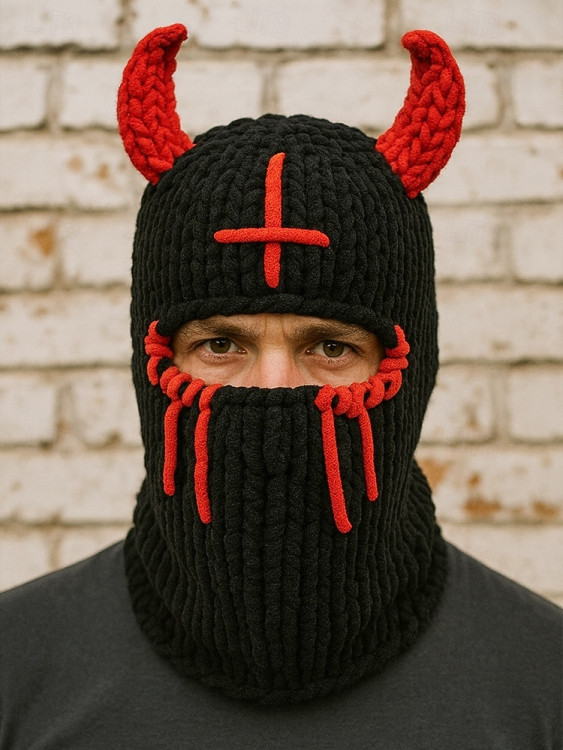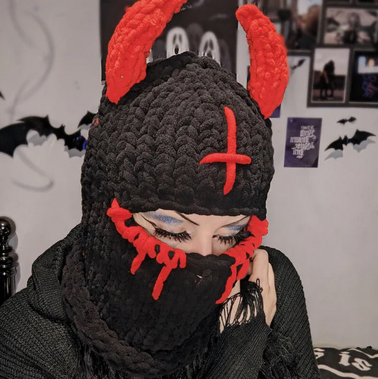 Pletený kulich (lyžařská maska) s rohy a obráceným křížem.