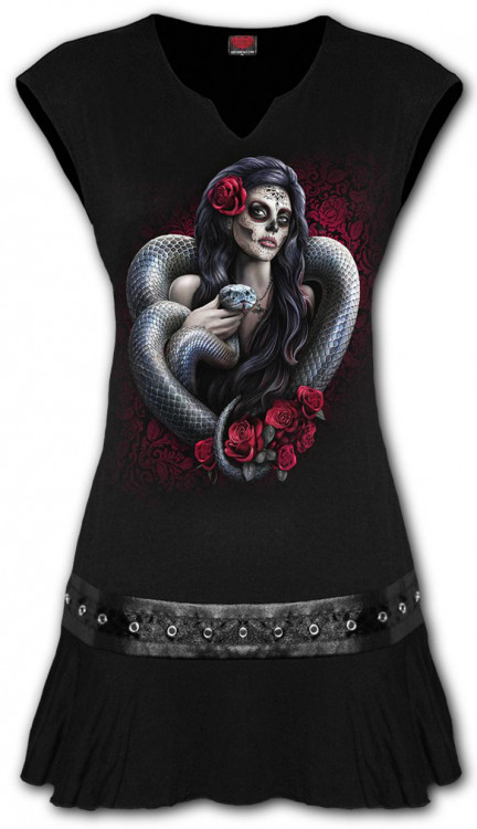 Dámské dlouhé tričko (tunika) s velmi profesionálním potiskem firmy Spiral Direct, která již přes třicet let zabývá potiskem merche s motivy, jako jsou lebky, draci, vlci, kočky, motorky, vikingové, metalové kapely, filmy.