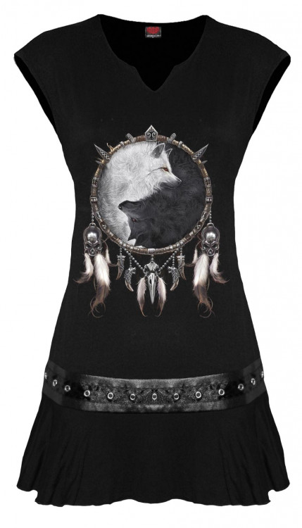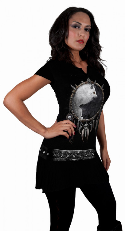 Dámské dlouhé tričko (tunika) s velmi profesionálním potiskem firmy Spiral Direct, která již přes třicet let zabývá potiskem merche s motivy, jako jsou lebky, draci, vlci, kočky, motorky, vikingové, metalové kapely, filmy.