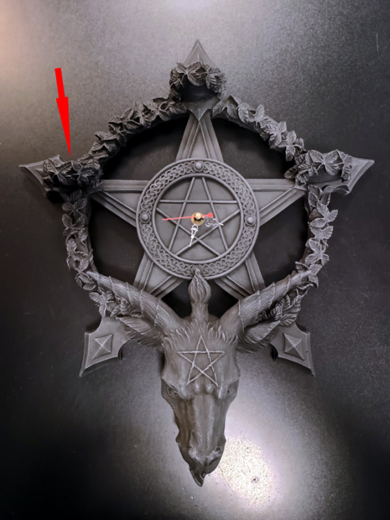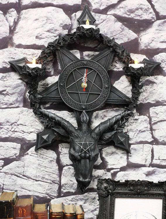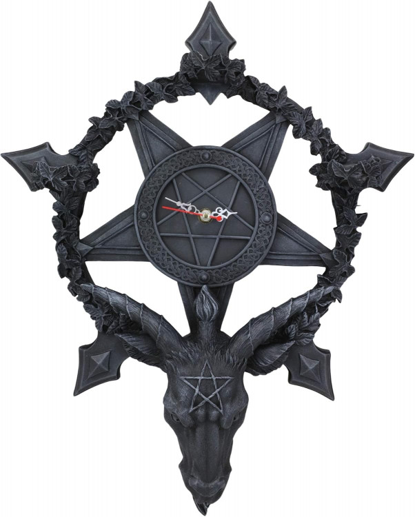 Hodiny z pryskyřice s motivem Baphometa a elektrickým strojkem Quartz.