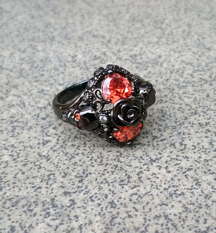 Ocelový prsten se zirkony, lebkou a růžemi.