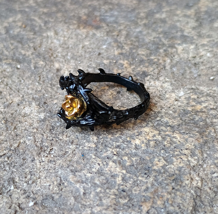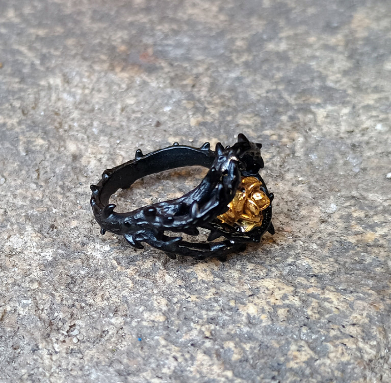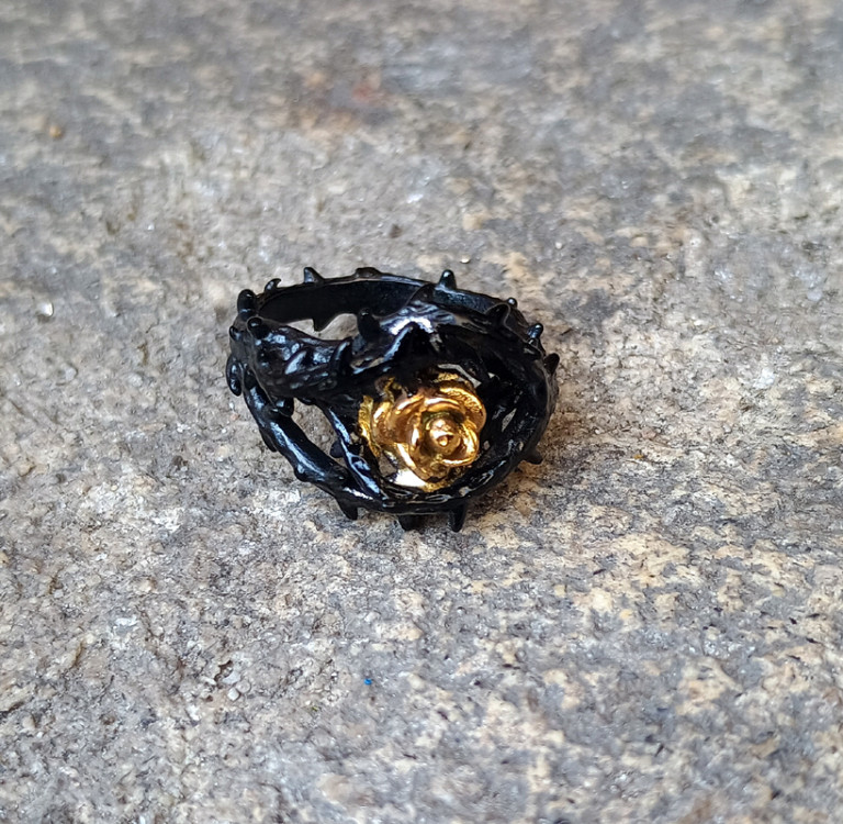 Ocelový prsten se zlatou růží a trnovou korunou.