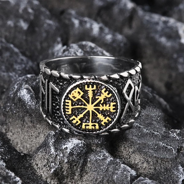 OCELOVÝ PRSTEN VIKING VEGVISIR AND RUNES - GOLD
