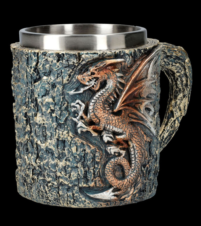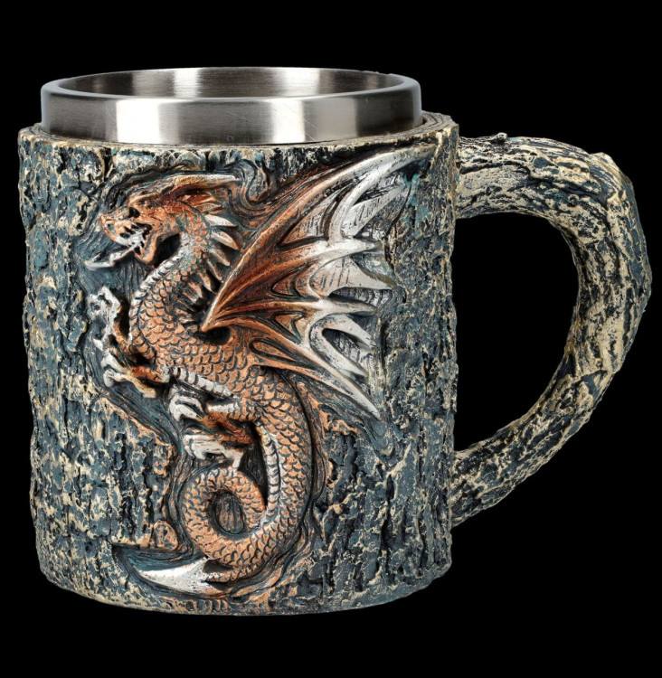Půllitr z pryskyřice s drakem. Nerezový střed lze vyndat a umýt v myčce.